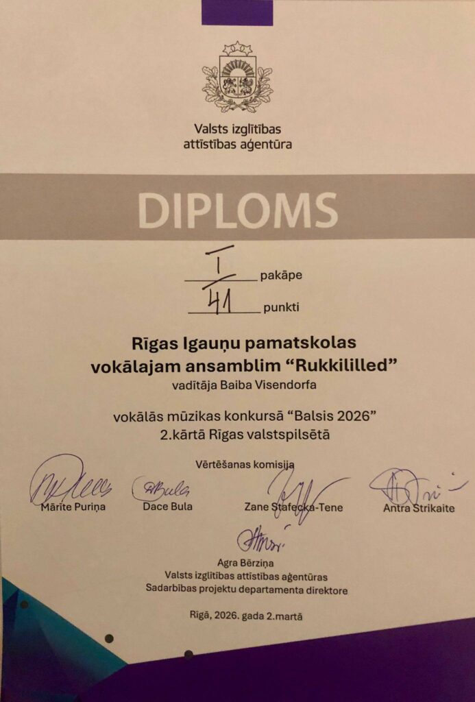 Mūsu skolas vokālais ansamblis Rukkililled 2.martā ar labiem panākumiem, iegūstot 1.pakāpes diplomu, piedalījās Rīgas vokālās mūzikas konkursa “Balsis 2026” otrajā kārtā, kas norisinājās Rīgas Skolēnu pilī.